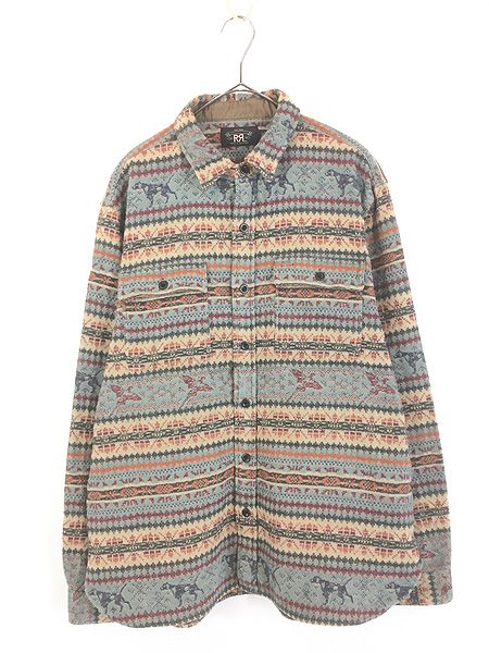 古着 00s RRL Ralph Lauren 犬 鳥 フェアアイル ボーダー マチ付 ヘビー フランネル シャツ ヘビネル L
