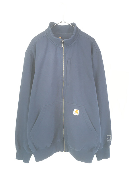 古着 Carhartt 「Rain Defender」 撥水 ワンポイント パッチ ハイネック ジップアップ スウェット トレーナー ネイビーL