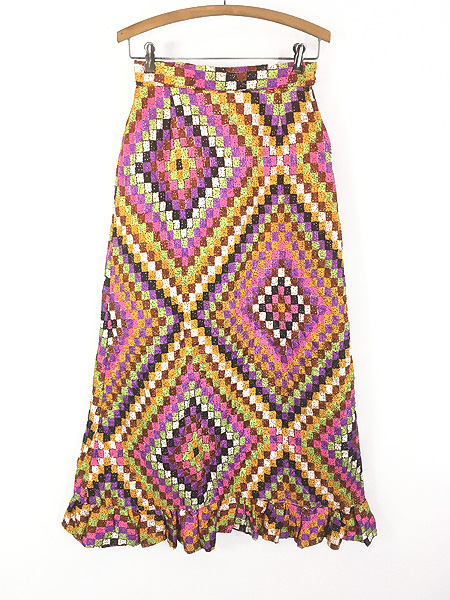 レディース 古着 60s コの字 ドットモザイク ダイヤ キルティング スカート ロング丈 S位