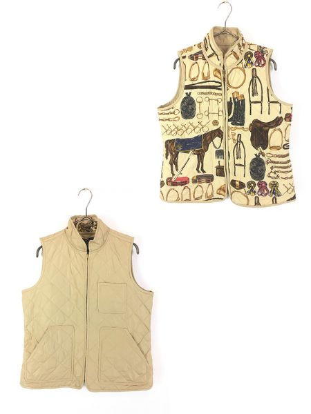 レディース 古着 90s LAUREN by Ralph Lauren 無地 × 馬具 乗馬 総柄 リバーシブル キルティング ベスト L