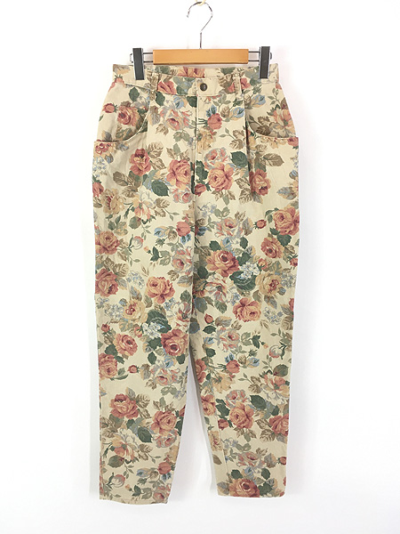 レディース 古着 90s USA製 FRENCH NAVY 花 フラワー 総柄 コットンツイル タック パンツ 12 W28 L28