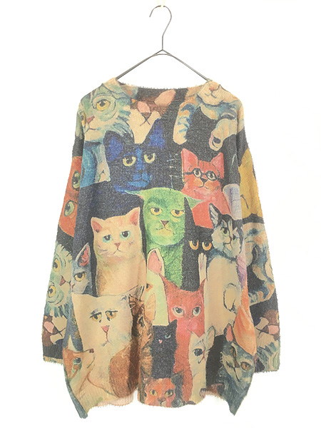 古着 猫 マルチ キャット アート オールオーバー コットン ウール ライト ニット セーター XL位