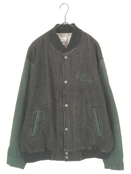 古着 90s DU PONT 企業 刺しゅう 2tone グリーン × ブラック デニム スタジャン ジャケット L