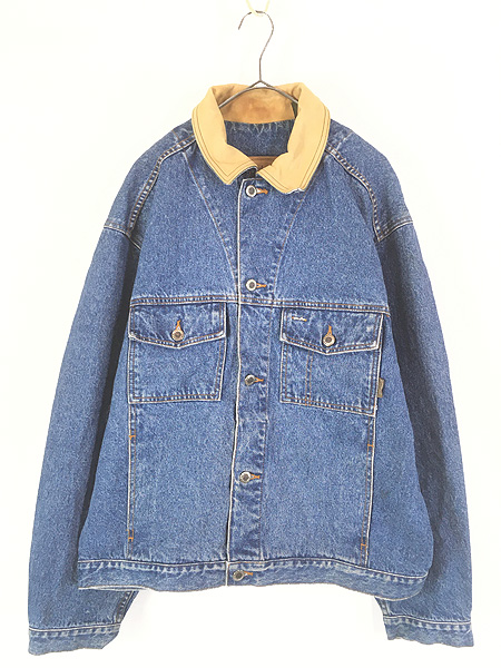 古着 90s Timberland 襟 本革 レザー デニム トラッカー ジャケット Gジャン L