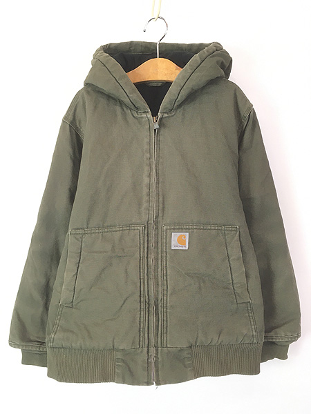キッズ 古着 Carhartt 防寒 裏地 キルティング セパポケ モスグリーン ダック ワーク アクティブ パーカー M 10-12歳