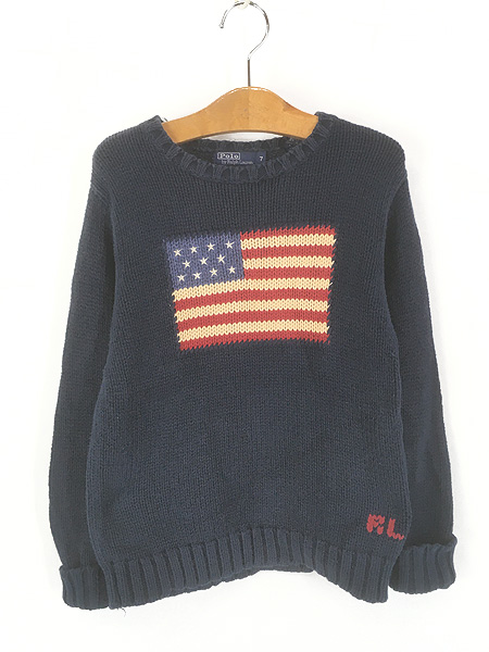 キッズ 古着 90s POLO Ralph Lauren 星条旗 フラッグ コットン ニット セーター 紺 7歳位