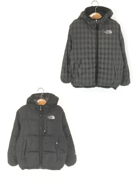 キッズ 古着 TNF The North Face 550 フィルパワー ブラック×チェック リバーシブル ダウン ジャケット S 10歳以上位