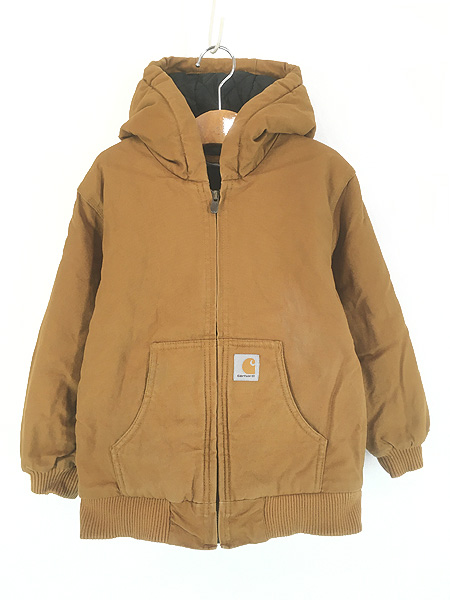 キッズ 古着 Carhartt 防寒 裏地 キルティング ブラウン ダック ワーク アクティブ パーカー S 7-8歳位