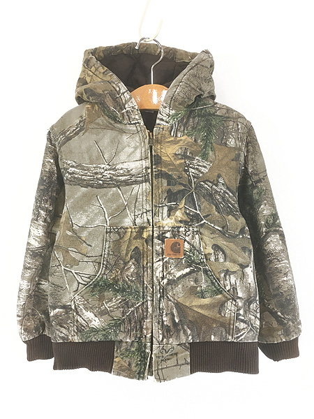 キッズ 古着 Carhartt 防寒 裏地 キルティング リアルツリー カモ 迷彩 ダック ワーク アクティブ パーカー XS 6歳位