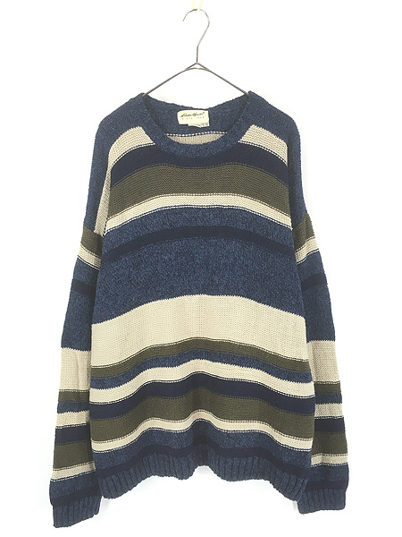 古着 90s Eddie Bauer マルチ ボーダー ローゲージ コットン リネン ニット セーター XL