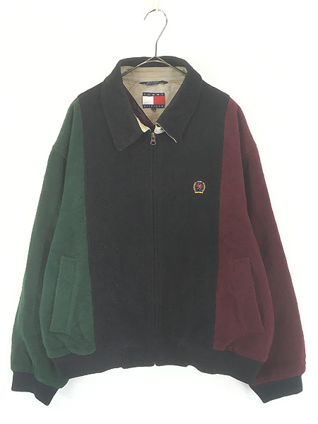 古着 90s TOMMY HILFIGER ブラック×グリーン×ボルドー 3カラー パデット ウール スウィングトップ ジャケット L