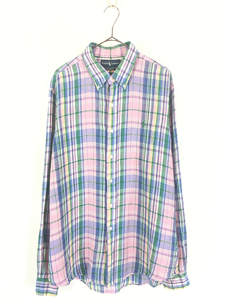 古着 90s Ralph Lauren 「CUSTOM FIT」 ピンク マルチ チェック 100% リネン BD シャツ XL