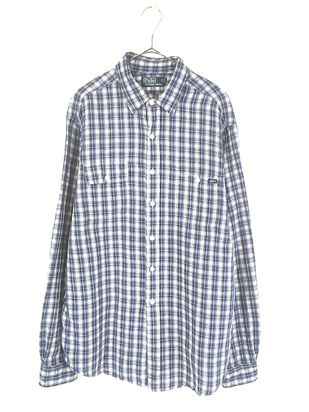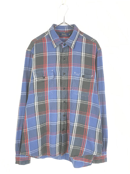 古着 Polo Ralph Lauren ひし形ボタン ブルー マルチ チェック ワーク ヘビー フランネル シャツ ヘビネル L