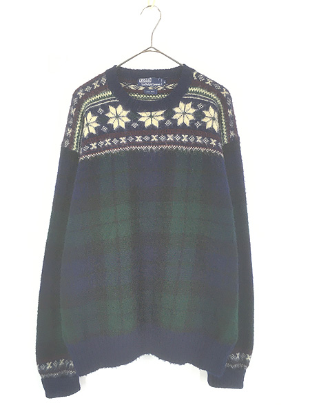 古着 90s Polo Ralph Lauren ブラックウォッチ チェック ノルディック 雪柄 ウール ニット セーター XL
