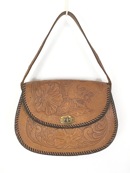 雑貨 古着 70s 花 ボタニカル カービング 型押し 本革 レザー ハンド バッグ