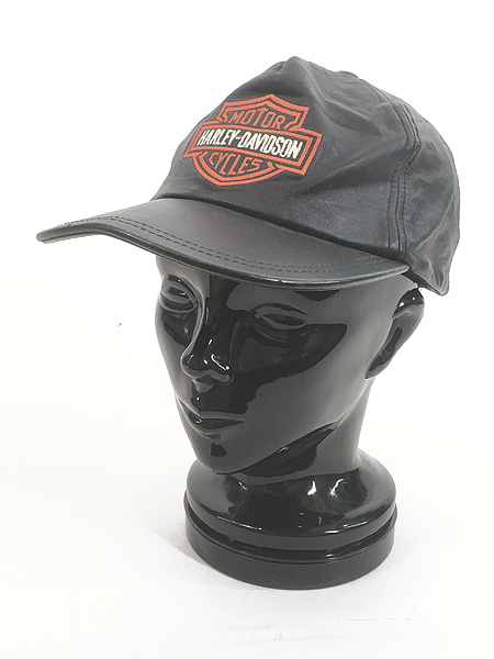 雑貨 古着 90s HARLEY DAVIDSON バー&シールド 刺しゅう 6パネル 本革 オールレザー キャップ 黒 帽子