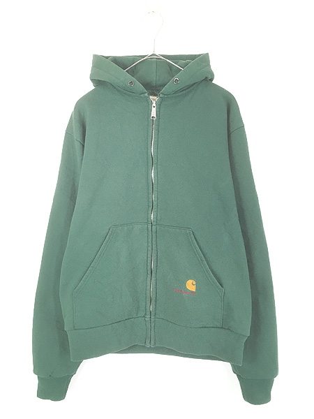 古着 80s USA製 Carhartt 裏地 メッシュ ワンポイント 刺しゅう スウェット ジップ パーカー グリーン L