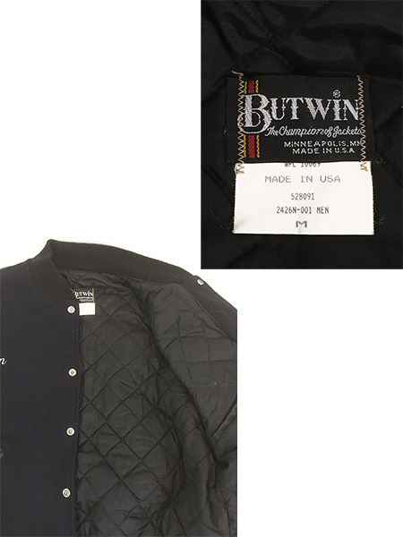 スタジャン等スポーツアイテムの名ブランド BUTWIN。厚手メルトンウール・牛革(カウレザー)袖・中綿入りキルティングライナー。