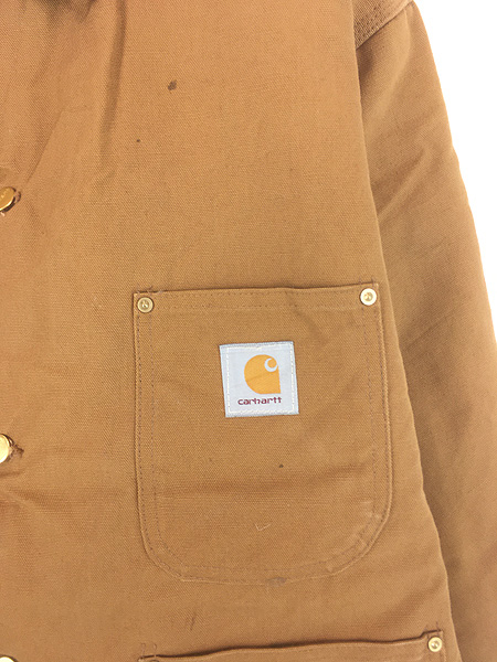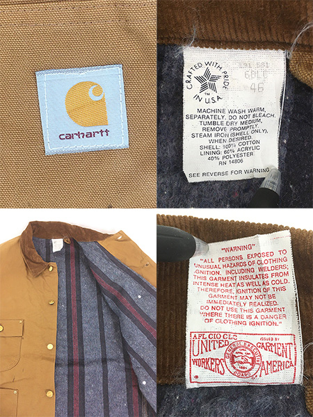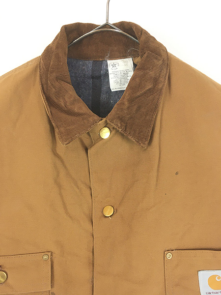 古着 80s USA製 Carhartt 裏地 ストライプ ブランケット ブラウン ダック ミシガンチョア カバーオール ジャケット 48