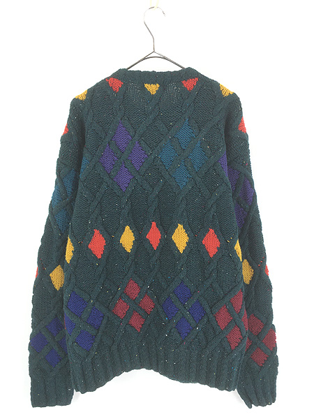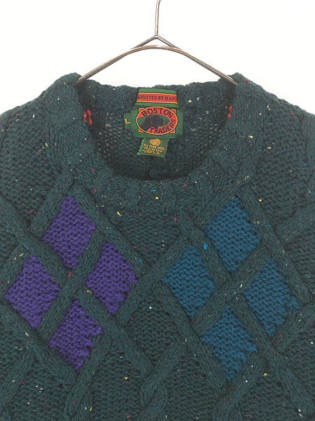 古着 90s BOSTON TRADERS ダイヤ ケーブル編み ミックス ウール ハンド ニット セーター L