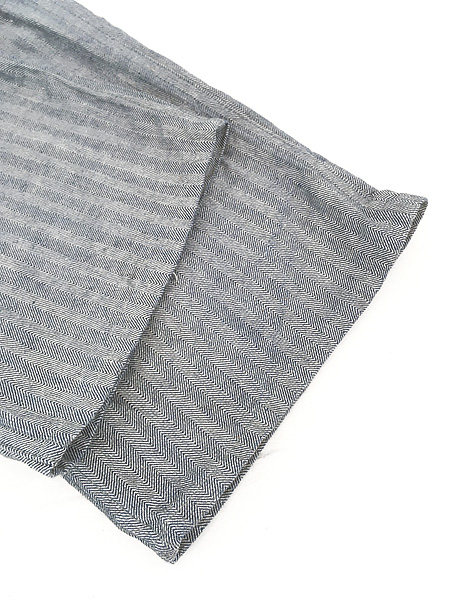 斜めベルタグ・ハリのあるヘリンボーンツイルコットン・台襟なし・フロント TALONジップ・スナップボタン・バックポケット下部あて布・イン&アウトシーム ダブルステッチ。