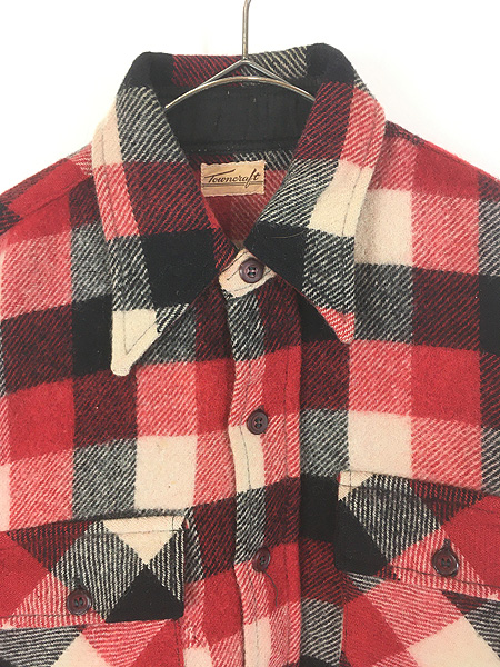 古着 40s Towncraft マチ付 ロングポイント襟 ブロック チェック ヘビー ウール シャツ XL位