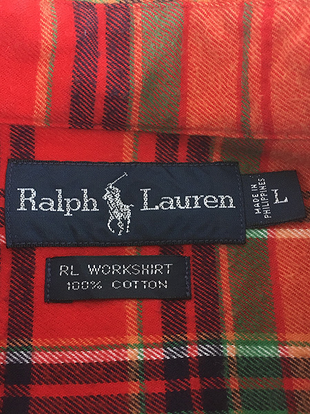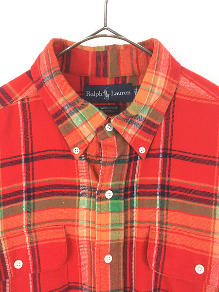 古着 90s Ralph Lauren 「RL WORKSHIRT」 マルチ チェック 3点留 BD フランネル シャツ ネルシャツ L