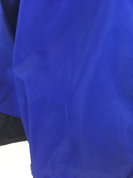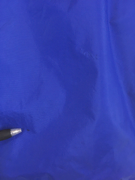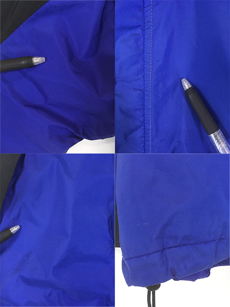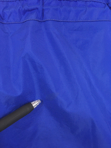 裏地メッシュ素材、フロントは刻印入りスナップボタンとジップ、裾とウエスト内側とフードにドローコード、脇下ベンチレーションジップ。このあたりの年代のジャケットに取り入れられている、バッグサイズに収納できるパッカブルのポケット「STOW POCKET」。