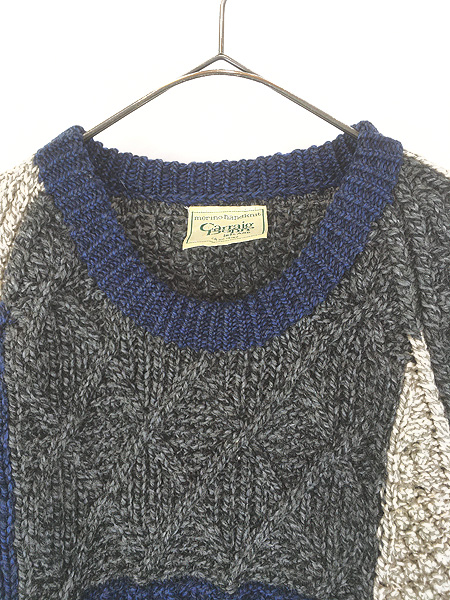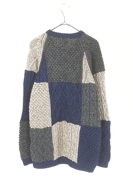 古着 80s Ireland製 Carraig Donn クレイジー パッチワーク ローゲージ ウール ハンド ニット セーター L