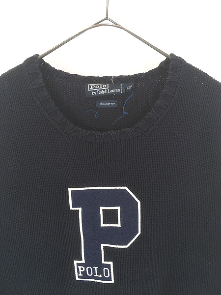 古着 90s Polo Ralph Lauren 「P」 フェルト パッチ コットン ニット セーター XXL