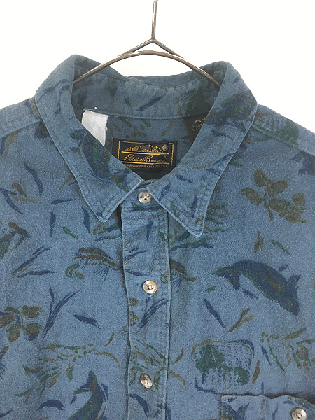 古着 80s USA製 Eddie Bauer おさかな 釣り アウトドア 総柄 フランネル シャツ ネルシャツ XL