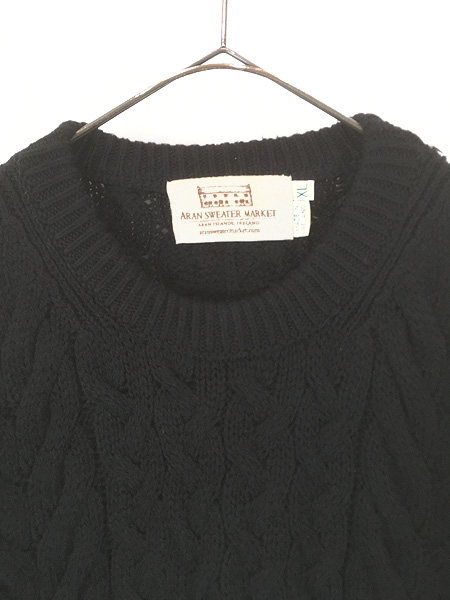 古着 90s Ireland製 Aran Sweater Market ケーブル編 ローゲージ ウール アラン フィッシャーマン ニット セーター ブラック!! XL