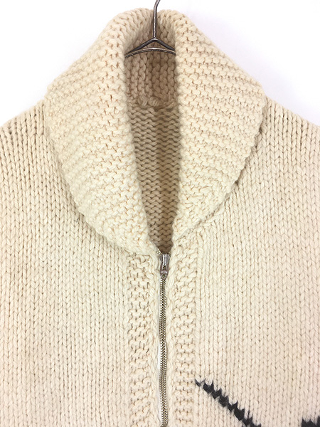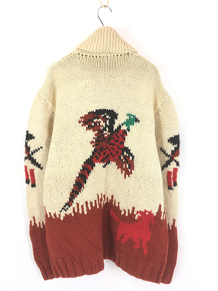 古着 70s 野鳥 犬 ハンティング 総柄 ショールカラー ローゲージ ウール ニット カウチン カーディガン ジャケット XL位