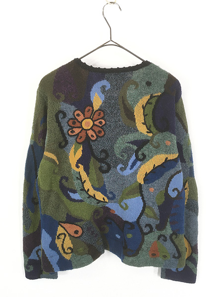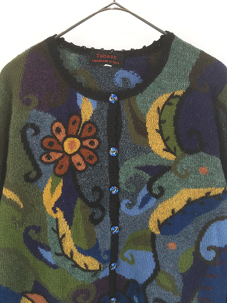 レディース 古着 Peru製 Tabask 花 フラワー リーフ アート デザイン ウール ハンド ニット カーディガン L