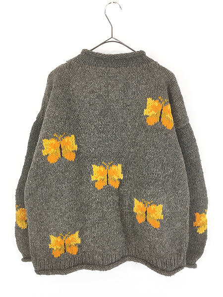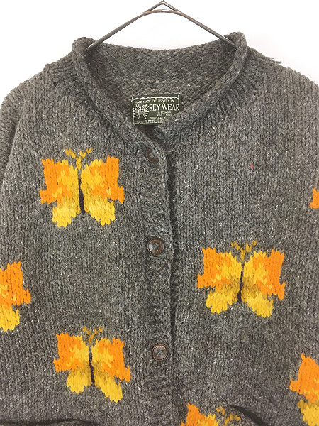 レディース 古着 80-90s エクアドル製 Rey Wear 蝶々 バタフライ 総柄 ヘビー ウール ハンド ニット カーディガン XL位