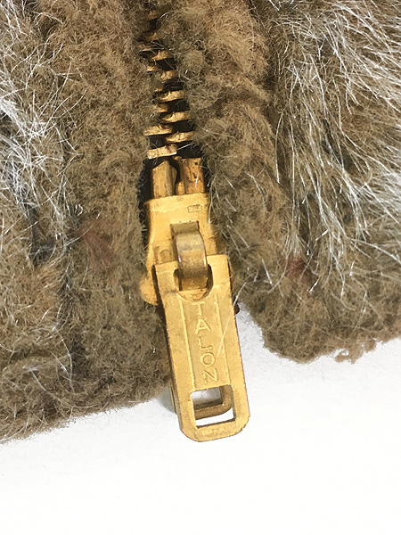 光沢感のある毛足の長いフェイクファー×シンプルなブラウンカラー。TALONジップ使用。