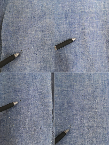 100%コットンシャンブレー・襟芯なし・猫目ボタン・トリプルステッチ。