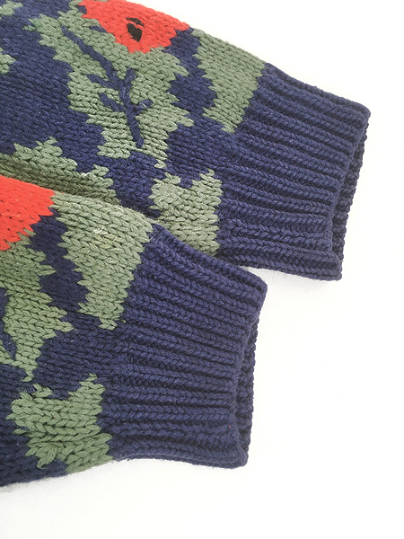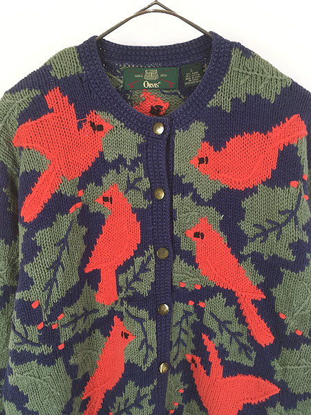 レディース 古着 90s ORVIS 鳥 バード アニマル 総柄 麻 コットン ニット カーディガン L
