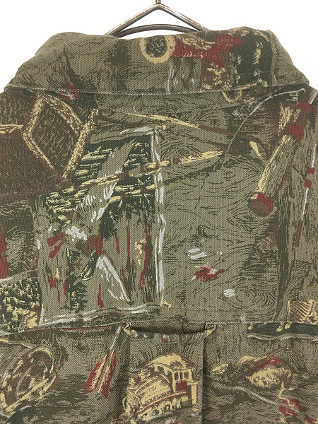 古着 90s Eddie Bauer 名品 「Elkhorn Twill」 釣り具 汽車 船 総柄 コットン ツイル シャツ L