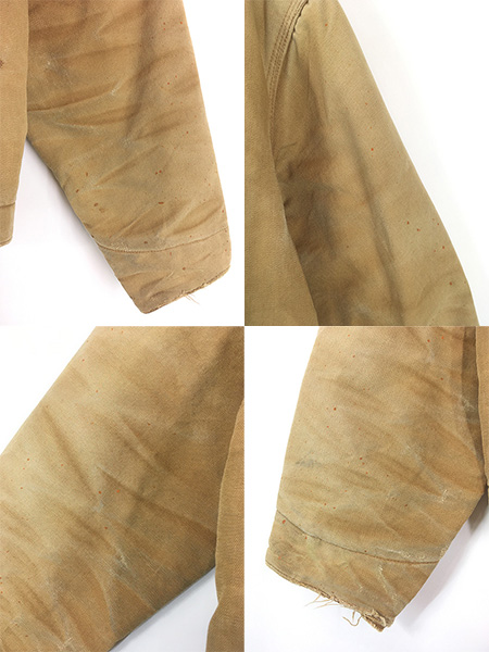 表地に12オンスのヘビーウェイトコットンダック、裏地には保温性に優れたストライプ柄のブランケット、袖裏地は中綿入りナイロンキルティング、コーデュロイの襟、腕の稼動範囲を広げるアクションプリーツ。