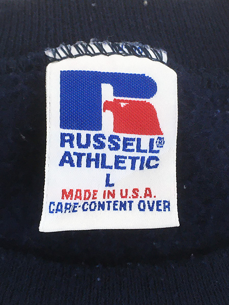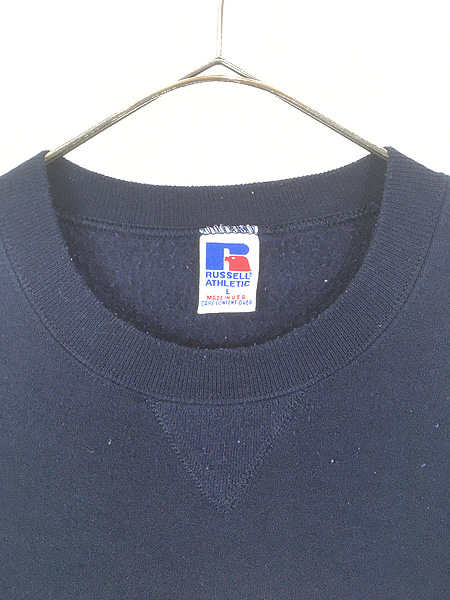 古着 90s USA製 Russell 「MICHIGAN」 前V セットイン スウェット トレーナー ネイビー L