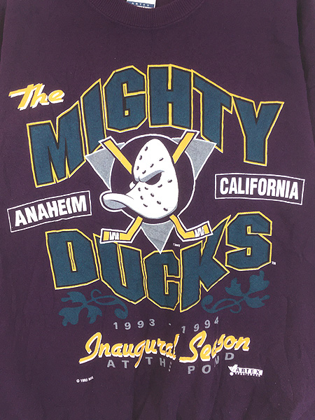 1992年にウォルト・ディズニー・カンパニーによって設立されたアメリカのアイスホッケーチーム「マイティダックス・オブ・アナハイム(現在のアナハイム・ダックス)」のプリントスウェット。1993年のコピーライト入り。