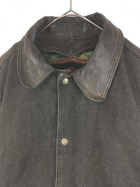 古着 90s USA製 WoolRich 本革 レザー襟 ブラック デニム ハンティング カバーオール ジャケット オールブラック!! ライナー完備 L