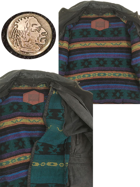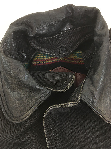 流通の少ないブラックデニム素材・襟本革レザー・インディアン刻印スナップボタン。