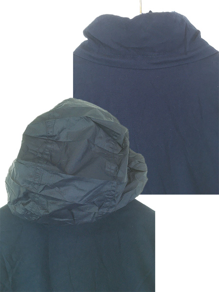 フロントスナップボタンとジップの二重構造、薄手のフードが首裏にジップで収納されています。