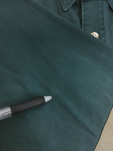 強度のあるコットン地、袖肘下にあて布、右肩にはキルティングガンパッチ、襟芯なしのレギュラーカラー。