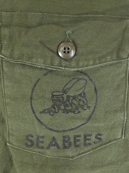 古着 70s 米軍 US NAVY SEABEES 100% コットンサテン ミリタリー ファティーグ シャツ 16 1/2