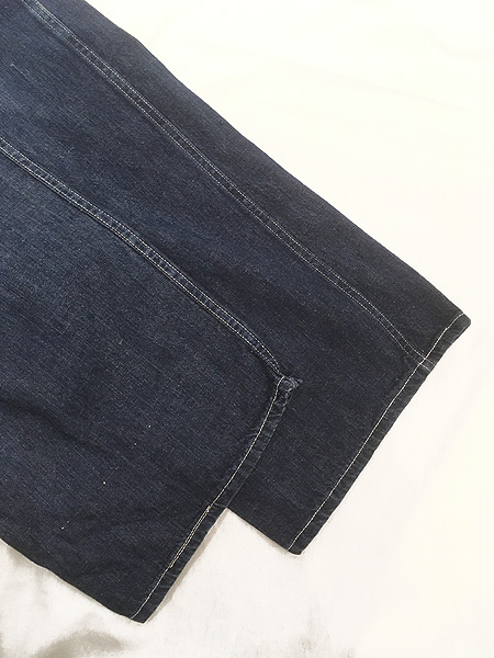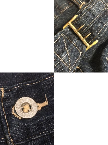 色濃く残るインディゴデニム・メタルボタン・針刺しシンチ・股上深めの太めストレートシルエット。