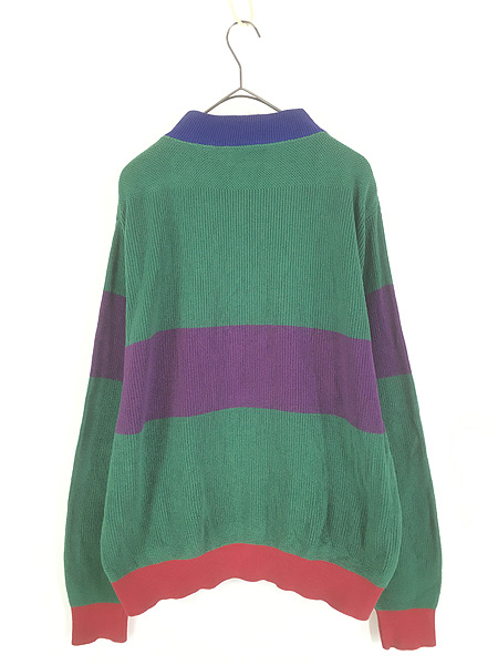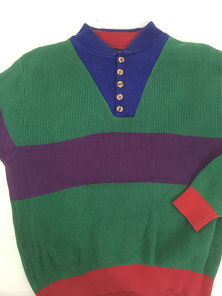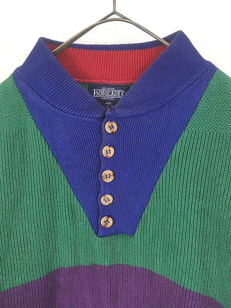 古着 80s USA製 LANDS' END クレイジー パターン 5ボタン ハイネック プルオーバー コットン ニット ジープ セーター L