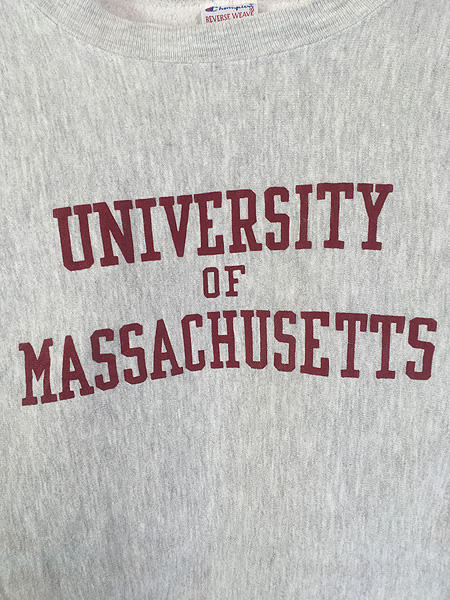 フロント「UNIVERSITY OF MASSACHUSETTS」3段ストレートプリント。